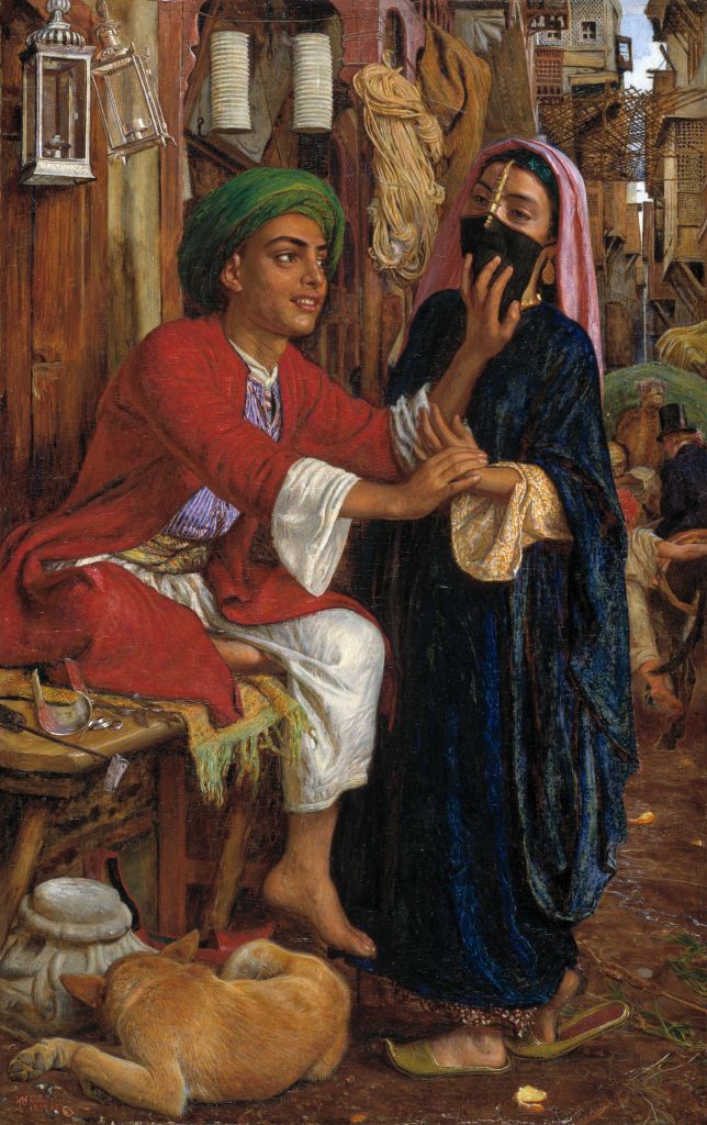 In A Street Scene in Cairo, Hunt intended to capture the unfamiliar sight of women wearing a veil, their appearance preserved to be revealed only to their husband – “I hope it may have some value as an illustration of an unwise state of society which as it appears is fast falling to pieces”.13 Later, Hunt recalled how he stumbled upon the subject, observing the encounter hidden in the dark, and what sense he could make of it:
