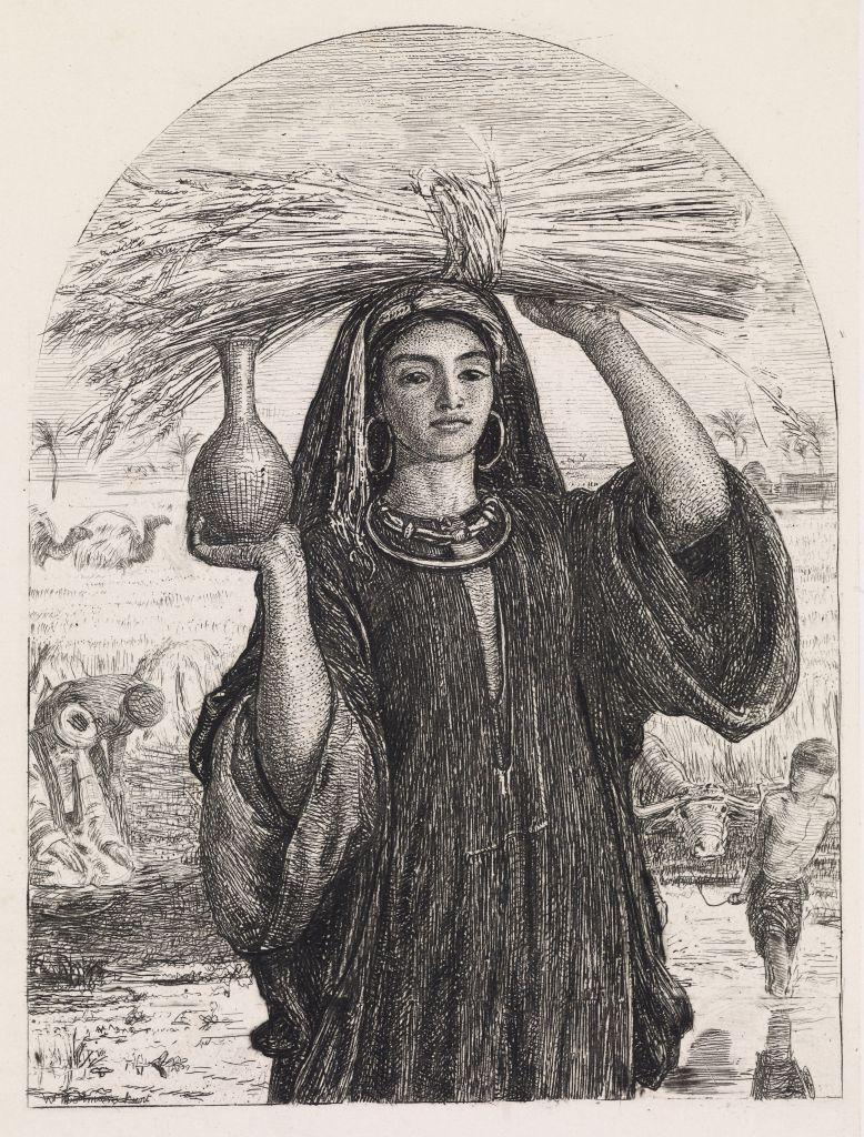 In the countryside, Hunt was surprised to see that peasant women did not cover their faces and was completely beguiled by fellaheen girls – “the most graceful creatures you could see anywhere”. Prowling around the villages he came across a woman and set out to paint a portrait of her in March 1854.15 The inclement weather and the woman’s reluctance to model meant that Hunt was only able to draw a quick sketch. Tirelessly reworking the canvas between 1860 and 1863, Hunt realised a life-size portrait of the woman and called it The Afterglow in Egypt. The towering female figure is depicted barefoot, dressed in traditional clothes, carrying a vase in her right hand and a wheatsheaf over her head. Around her and in the background a plethora of birds is painted in fine detail, on the other side of the river are haystacks, and in the far distance a few palm trees and a camel (the only other exotic reminder). Hunt also painted a smaller version containing a few compositional changes now in the Ashmolean Museum. Gone are the birds replaced by a calf and a boy pulling a cow across the river, and instead of the wheat sheaf the woman is shown carrying a crate with pigeons. Also worth noting is the slight change in her pose and drapery both hinting at classic and renaissance prototypes, a reference that is reflected in the thick linear gilded frame with four embossed roundels reminiscent of Quattrocento altarpieces. For the final version, Hunt interestingly dropped the classicising allusions and opted for a more realistic depiction where the exotic setting is further enhanced by the flamboyant frame with an arched top and pseudo-oriental motifs. Hunt painted the smaller version for a passionate patron and collector of Pre-Raphaelite art, Thomas Combe (1797-1872). While a biographer claimed that the changes were made for the sake of variety, the amendments in the woman’s pose and clothes are not so subtle allusions to the Botticellian models made popular by the Brotherhood.16 Perhaps Hunt made those adjustments to appeal to Combe’s taste or perhaps the exotic subject suggested to him another kind of historical displacement.