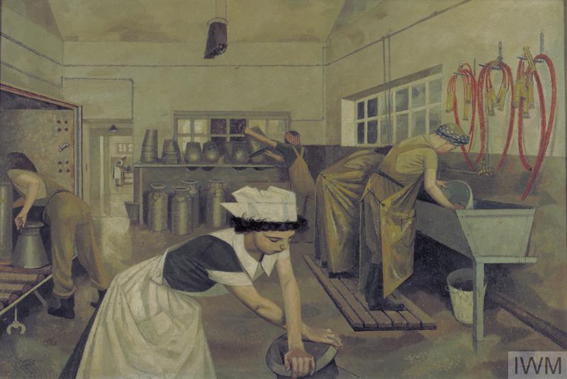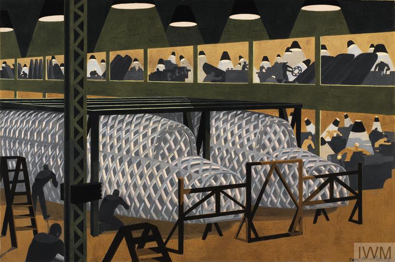 Going back to Out of Chaos, Clark proceeded to illustrate the WAAC commissions whereby artists were given subjects that resonated with their style. For example, aircraft manufacture suited the preference for sharp abstract forms of a painter like John R. Armstrong (1893-1973). Evelyn Dunbar (1906-1960), the only female war artist employed full time by the committee, was tasked with documenting the Women’s Land Army. Leslie Cole (1910-1976) was made the committee’s official artist in Malta.