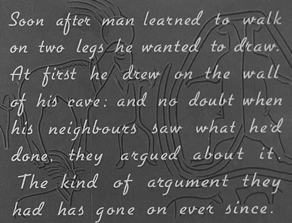 What place does art have in society? Ever since the primitive man traced the first cave drawings, contemporaries have been arguing about it. Reconnecting to this opening remark, the second part of the documentary attempted to answer this immemorial question focusing on interpretation. Returning to the National Gallery, viewers listen in to the comments made by ordinary visitors: “I can’t explain what I mean, but I know what I like”, “If this is painting, my small son’s a genius”, etc. The commentator hands it over to Eric Newton (1893-1965), a well-known name to the British public for his radio broadcasts, who embodies the enlightened art critic, the savant who understands and interprets art for the wider audience. At the bewilderment of bystanders, Newton praises Limestone Quarry by Graham Sutherland, only to be challenged: has the artist even seen a real quarry? Moreover, the painting needs explaining but beautiful pictures should be self-explanatory, another visitor interjects. The camera then follows Graham Sutherland (1903-1980) sketching in the limestone quarries in Hindlow, Derbyshire. Accurately studying the subject, Sutherland is “storing details” that he will later use for his composition completed in the studio. What appear as concessions to reality, such as the dark sky, are expressive choices to convey a feeling of the place. The cinematic medium is used to demonstrate this: changing colour fields show different options, and animated arrows highlight the composition.