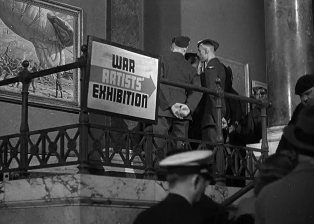 The film opens on the National Gallery bustling with visitors, even busier than in peace time, the voiceover comment underlines. What sort of people like to look at paintings for leisure? A cross-section is shown in answer to the narrator’s question: a soldier on leave, a couple, businessmen, and a bespectacled intellectual, the more typical museum goer. The voiceover presses on: The voice presses on: “Why in the height of war should there be this terrific interest in painting?” In 1939, artists stopped making art, paintings in houses were taken down, art dealers shut their shop, and the walls of public art galleries were stripped. The National Gallery was no exception as its masterpieces were transferred to hiding places in Welsh slate quarries. In their place, modern works of art were put on display in the first exhibition of war artists that opened in July 1940.