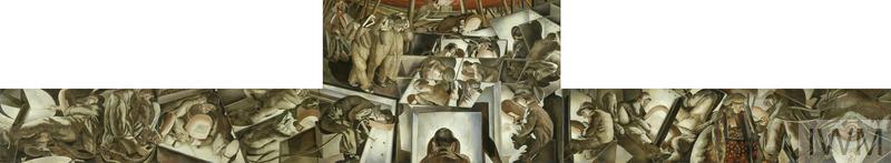 The first artist starring in the documentary was Stanley Spencer (1891-1959), whose interest in everyday life made him particularly apt to represent shipbuilding. Taking inspiration from a shipyard in Port Glasgow, Spencer painted a large-scale canvas Welders completed in his studio back in Cookham, Berkshire.18 Viewers could have easily understood the realistic depiction, but the words of critic Eric Newton are chosen to describe the painted scene compared to a mediaeval Last Judgement.