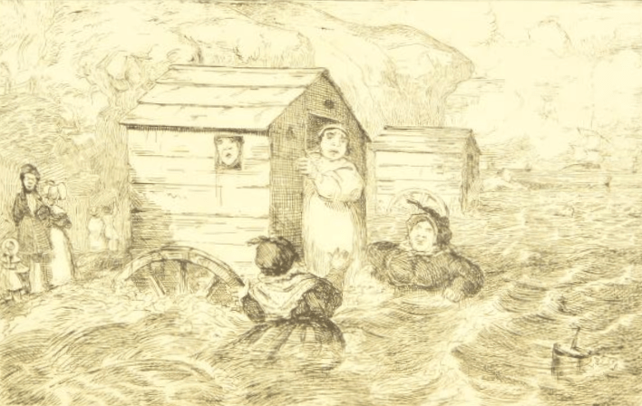 Coastal towns, also known as ‘watering places’, were initially attractive for the curative benefits of sea-bathing. An amusing guide (1833) penned by Alfred Crowquill [nom de plume for the Forrester brothers – Charles Robert (1803-50) and Alfred Henry (1804-72)] ironically described the different types of people that flocked to watering places. On doctor’s orders, the renovating, invigorating sea air brought together the “lean spinsters, with slender pittances” as well as families, but also the “imbiber of foreign wines and spirits”, the “black leg and gambler”, “old bachelors”, and especially, “the burly bathing-women, enveloped in blue flannel garbs […] ducking timid ladies and kicking infants”.2 Whether for health or recreation, in the course of the 19th century, watering places went from being the purview of the upper classes to almost a mass phenomenon – as recorded by Edwin Lee in 1859.3 As travelling improved, British spas could not compete with the quality of spring water on the continent and those who could chose to go to France and Germany, instead. “Recreation and society” being, on the other hand, what most visitors were looking for, the watering places that could provide varied forms of entertainment were preferred.4 Staple activities included sea-bathing, walking on the promenade, riding donkeys, collecting shells, enjoying the sand, and visiting local monuments. For all manner of conditions, sea-bathing was often recommended by physicians for its remedial effects.