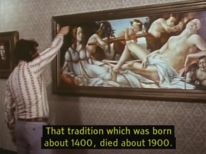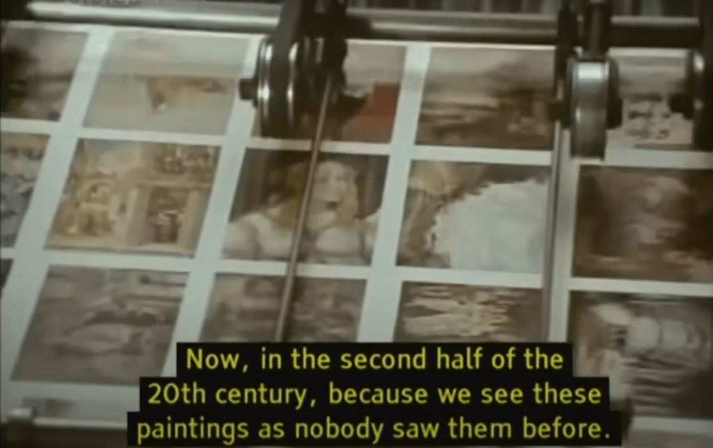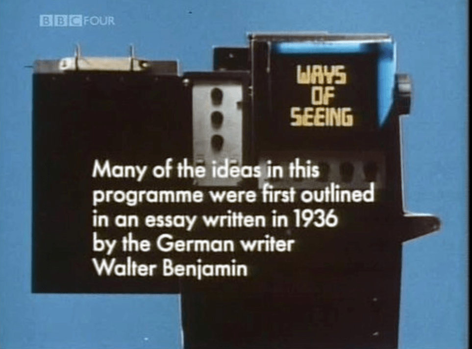 Benjamin’s ideas remained fairly unknown until Adorno edited a collection of his writings in 1955.12 Ripples of the essay on image reproducibility reverberated in another author, Arnold Hauser (1892-1978), whose Social History of Art (1951) provided a summation of Benjamin’s theories. It was not until the late sixties, however, that The Work of Art in the Age of Its Technological Reproducibility would appear an English translation as part of the selected essays Illuminations (1968).13 In 1972, Benjamin received a wider popularisation in the BBC2 documentary Ways of Seeing by John Berger (1926-2017). Berger began the now celebrated TV series by cutting into what we later learn to be a reproduction of Botticelli’s Venus and Mars. His aim was to show the decontextualisation and manipulation implicit in photography and cinema. Referencing to Benjamin, Berger proceeded to demonstrate how the invention of photography had altered the perception of art and how mass reproduction had damaged the aura of works of art. Taking Benjamin’s argument further, Berger examined the exploitation of images in advertising, television, and news information at the service of patriarchy and western imperialism.14