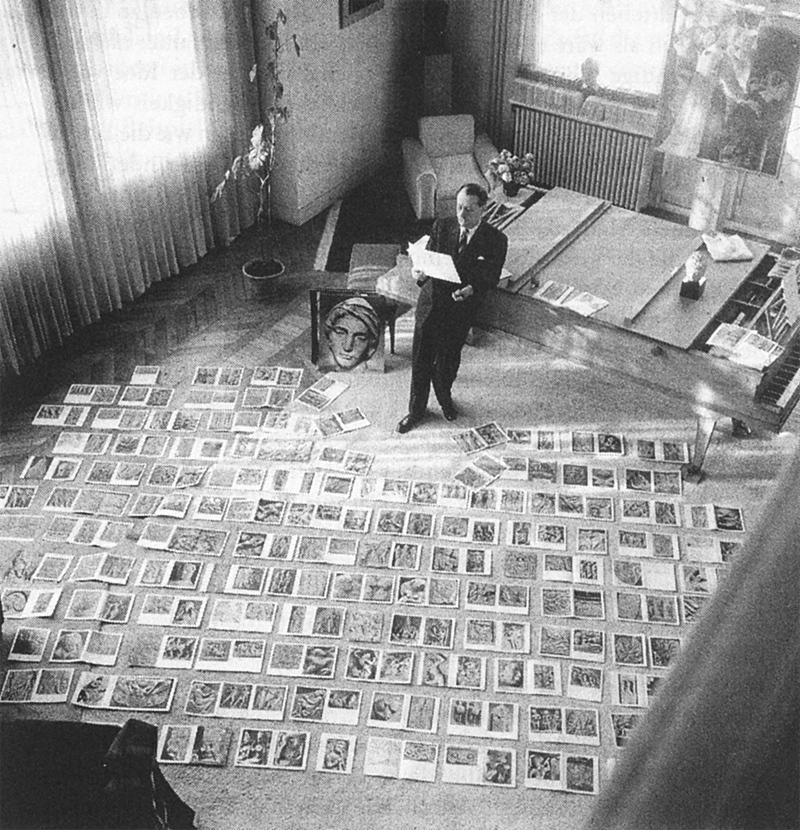 By presenting an anthology, the corpus of an artist or a school, photographic reproductions forged a new hierarchy based on how a masterpiece compares not to its (classical or Italianate) rivals, but on its belonging to a typological family.18 Photographs invariably shifted the focus from the material object to its style. In an illustrated book, the differences in technique or size were obliterated. Lighting and scale can had the power of elevating details or minute fragments to the status of the Elect, changing the outlook on certain art forms. Ancient or tribal sculpture could in this way could be made out to fit a sense of spurious modernism. True to his ideas, Malraux was the subject of an iconic photograph of him selecting pictures for the next book, Le Musée Imaginaire de la Sculpture Mondiale (1952). Quite aptly, this ubiquitous photo came to be identified with the discourse on photo reproductions or, more in general, the art historian’s work.19