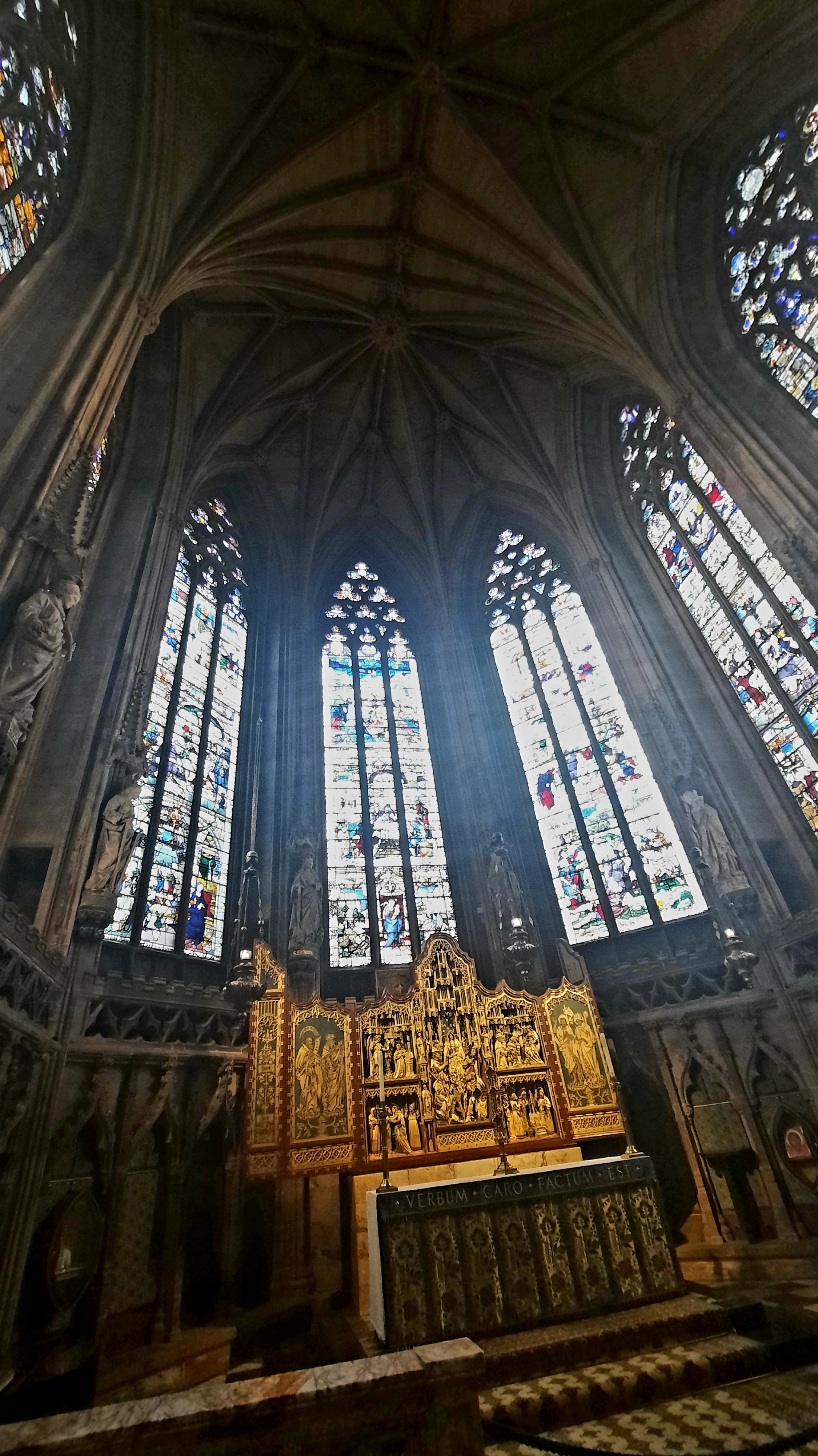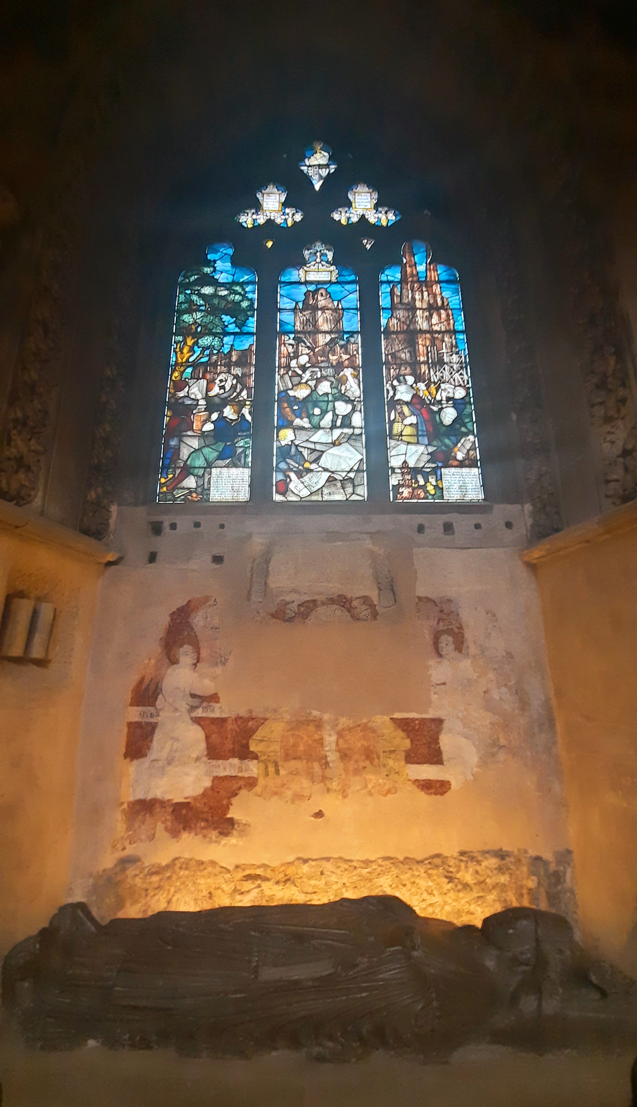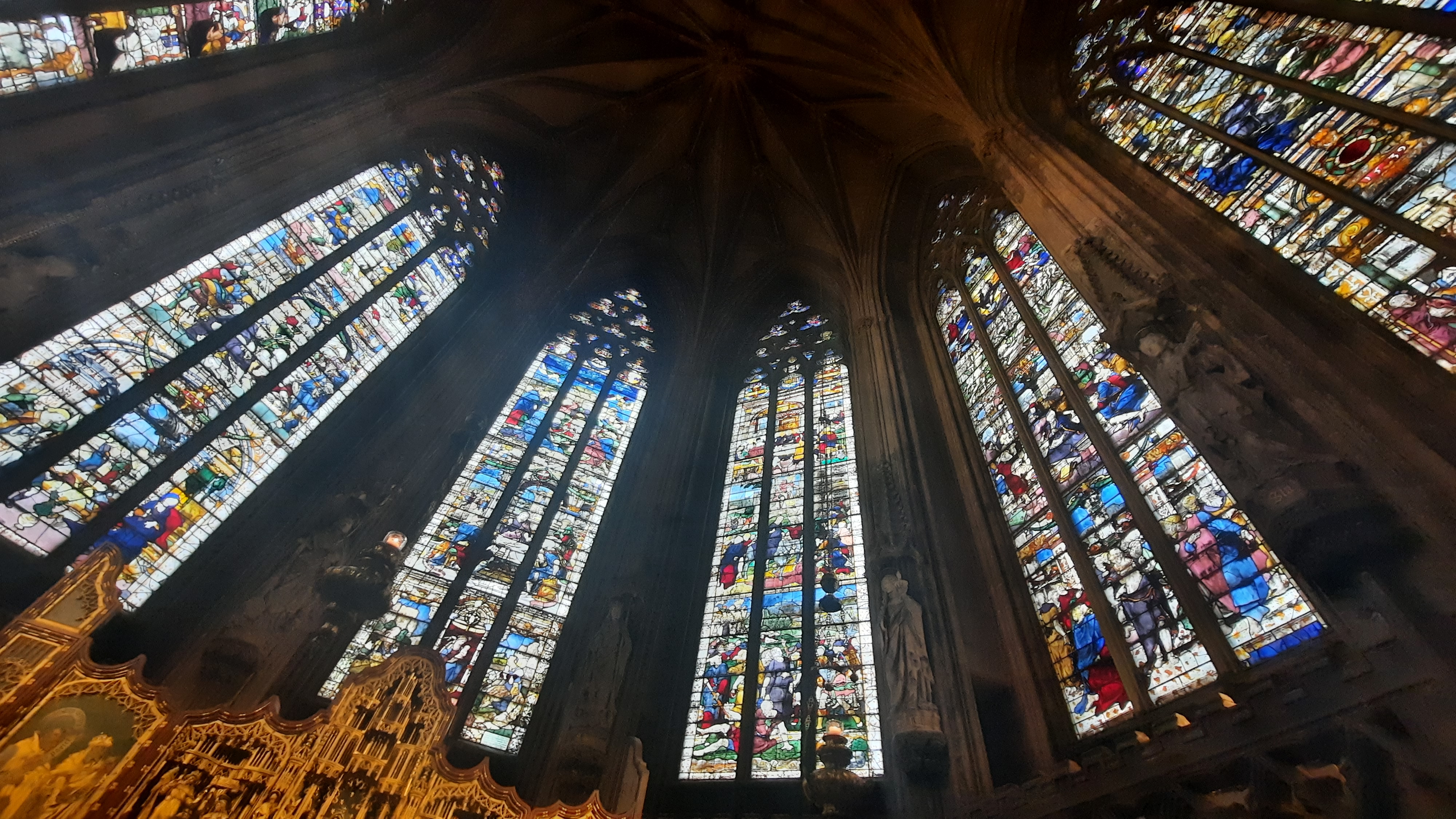 Langton’s greatest accomplishment was the polygonal Lady Chapel, often compared to the Sainte-Chapelle in Paris. While its polygonal apse is more typical of continental Gothic, its large decorated windows also tell an interesting story. Dating from ca. 1530, the stained glass originally came from a monastery in Herkenrode, Belgium. In 1803, a Derbyshire aristocrat and poet, Sir Brooke Boothby (1744-1824), secured 300 panels from Herkenrode Abbey and sold some of the glass to Lichfield cathedral. After a long journey from Liège to Hull, they made their way to Lichfield’s Lady Chapel. As the measurements did not fit, the stonework was altered to accommodate the panels. Juxtaposed to the Belgian decorated glass are the windows designed by Charles E. Kempe (1837-1907). More or less seamlessly, the 16th-century style of the former can be compared to its Pre-Raphaelite revival.