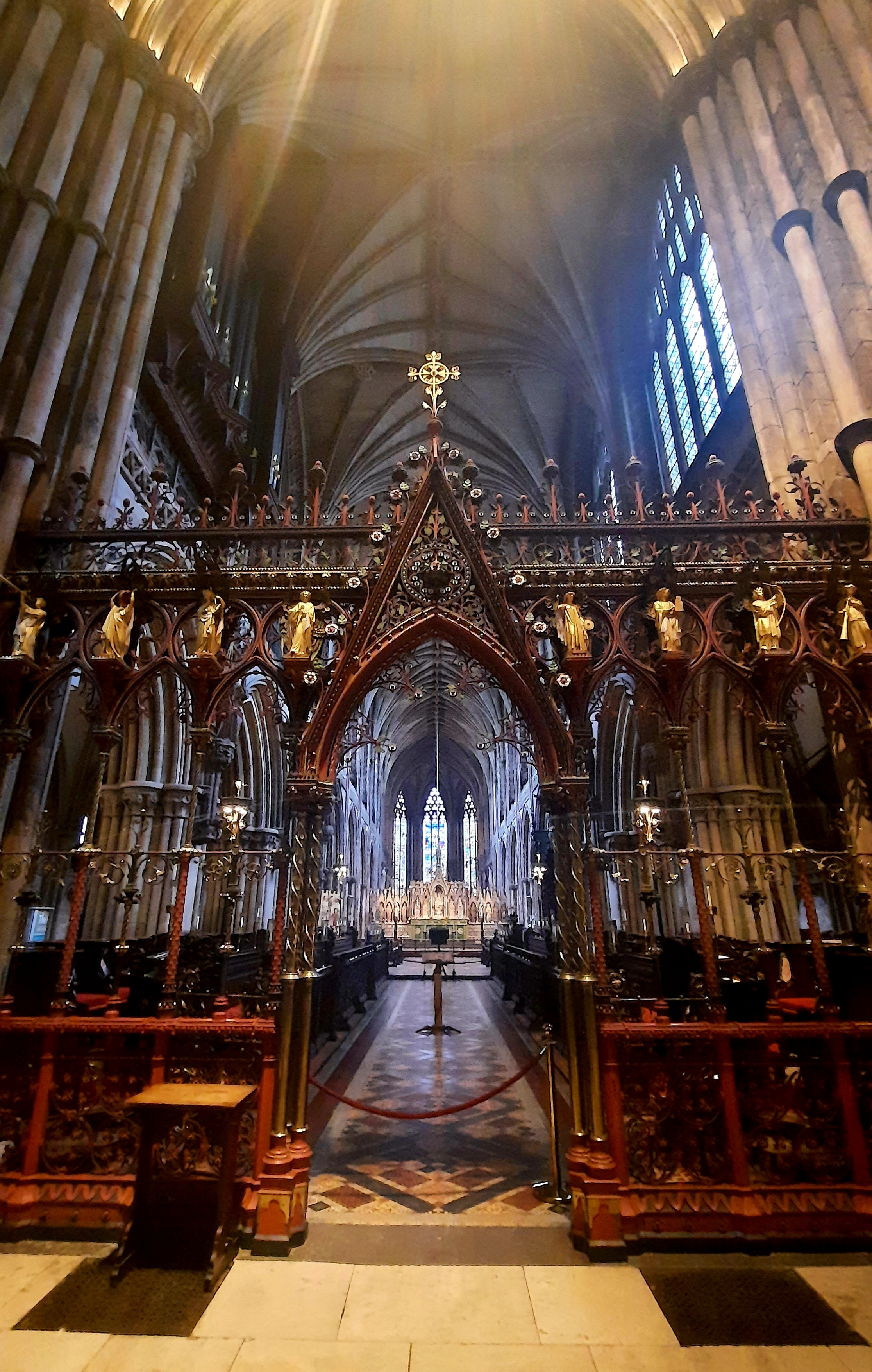Not unlike many Gothic churches, Lichfield cathedral suffered severe damage during the Civil War when it was besieged three times by the Royalists. As a result, the church was extensively renovated between the late 18th and the 19th centuries. The first remedial conservation work on the roof and the carvings was undertaken by James Wyatt (1746-1813) between 1788 and 1795. Then, in 1856, the famous Victorian architect, George Gilbert Scott (1811-1878), proceeded to rebuild the church in a sympathetic Gothic style. The west front was renovated following the principles of Gothic Revival. The carvings of kings and queens vandalised during the Civil War were repaired in few instances and for the most part replaced with modern replicas. But the Victorians also updated the series with new statues like the effigy of Queen Victoria carved by her daughter, Princess Louise. Scott also designed a new metal screen for the choir that was made by the famous metalworker from the Midlands, Francis Skidmore (1817-1896), between 1859 and 1863.