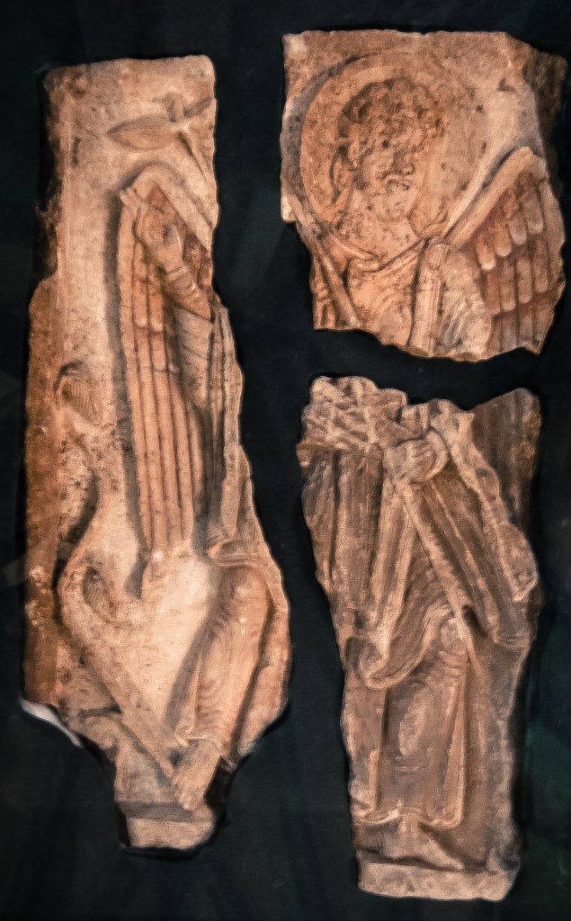 The Lichfield Angel is a remarkable survival of early mediaeval sculpture. Uncovered during restoration work in 2003 under the nave, the Angel came from St Chad’s original stone shrine built by Hedda in 800 AD. The carving depicting the Archangel Gabriel probably belonged to St Chad’s chest alongside another panel with the Virgin Mary as part of an Annunciation group. Its exquisite quality can be appreciated in the fine detail of the wings, the wavy folds of the drapery, and the traces of red and white pigment.