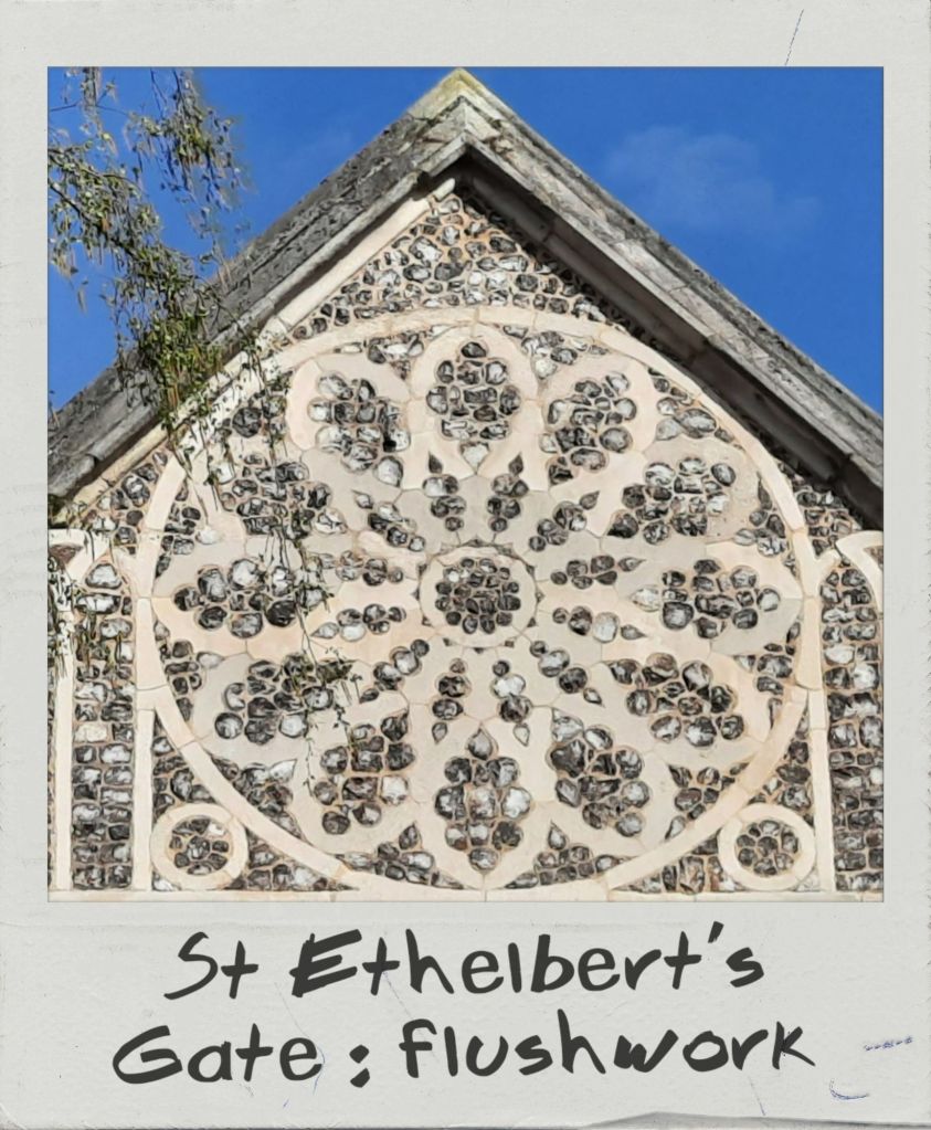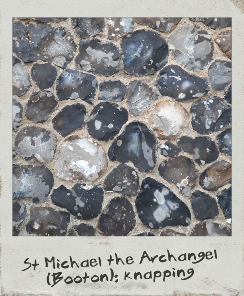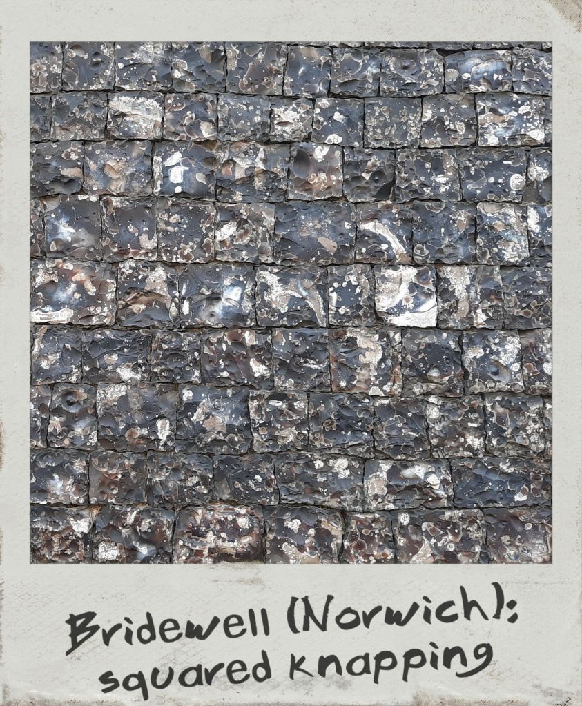 Norfolk architectural landscape is historically synonymous with its ubiquitous building material: flint. This nodular, crystalline stone originates from sedimentary rocks such as chalk or limestone and is composed of quartz in varying degrees of purity. As a result, flints may range of colours, from white or light grey to brown and black. Naturally found in fields or on beaches, this readily available and very durable mineral was already used in constructions by the Romans. Unfaced flint embedded in mortar was the first most common application, as can be seen in the Late Roman fort of Burgh Castle. By the 14th century, new techniques turned flint into a more polished and decorative material. Knapping involved smoothing one face and tapering the back to obtain a cone bedded into mortar. Galleting allowed to mask the mortar by pushing small flakes of stone in the interstices between flints. The most refined (and expensive) method was squared knapping, where flints were squared to obtain a uniform surface with almost no mortar infill left exposed. Beyond the decorative purpose, these techniques were perfected essentially to protect the mortar from deteriorating. Flushwork, on the other hand, consisted in creating ashlar panels with cut-out shapes filled with squared knapped flint to form decorative motifs.
