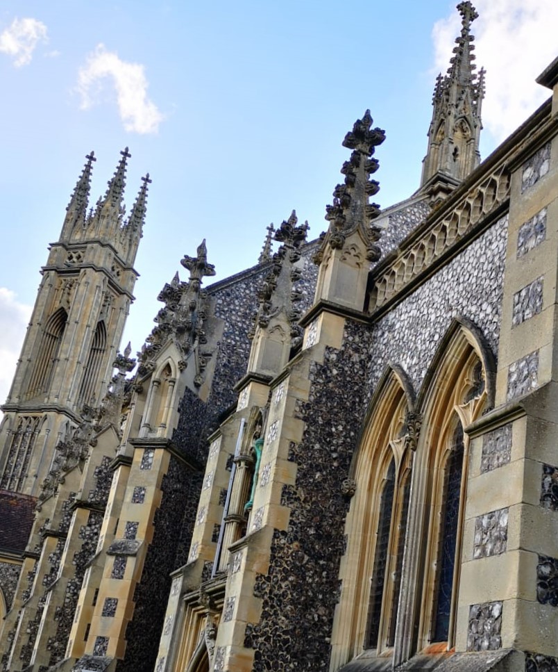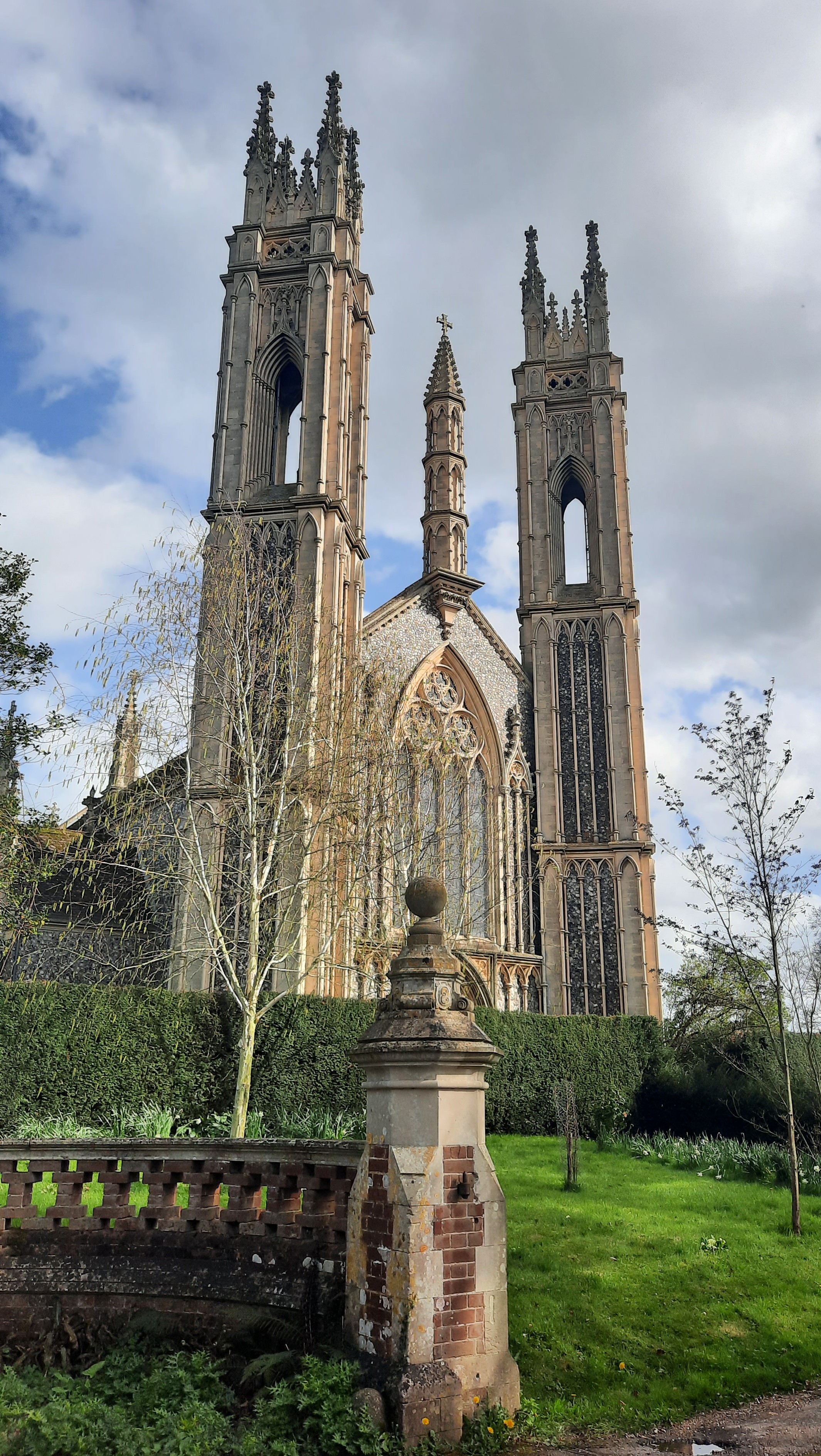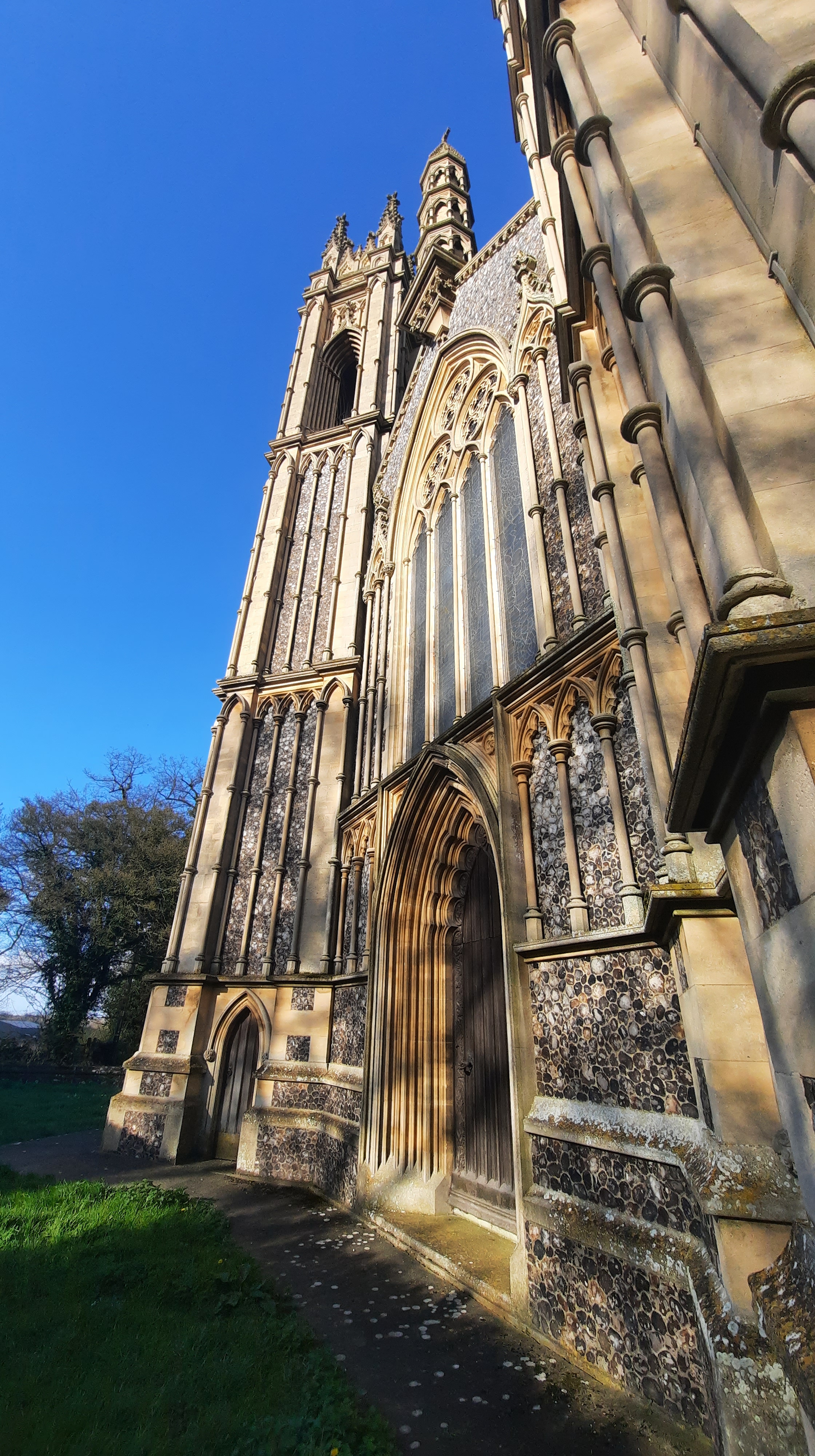 A short drive from Norwich took me to visit this whimsical building. The pinnacles of what at first appears to be a Late Gothic church towering over the undulating countryside between Cawston and Reepham. What could justify the imposing size of this church? Not located in a centre of any significance, the church is surrounded only by a few farms, cottages, and a school converted into a house. Did it belong to a former monastery? Was it part of the estate of a country house?