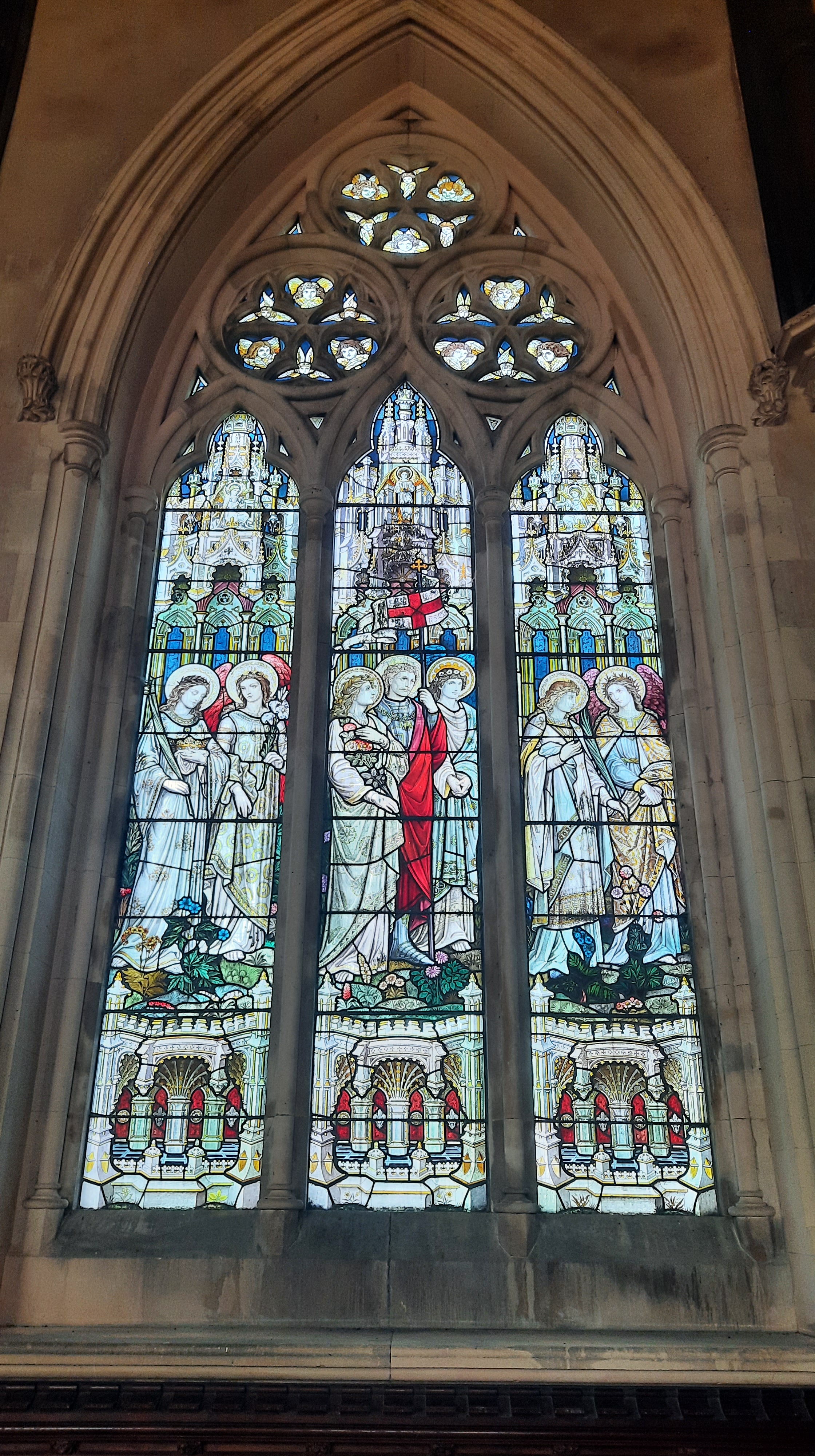 Completed between 1880 and 1900, the stained-glass windows in the chancel and baptistry were designed by Cox, Sons & Buckley and the later ones in the nave by Alex Booker. Elwin closely supervised the style and subject of the decorated windows, rejecting any reference to the much-disliked Pre-Raphaelite Brotherhood. Theories of angels and the Church Triumphant were deemed suitable for a church dedicated to St Michael, along with scenes from the Old and New Testaments. In the nave, religious iconography gave way to personal fancy with mass of figures whose angelic, feminine faces depicted Elwin’s ‘Blessed Girls’, a moniker the clergyman used for his female friends.