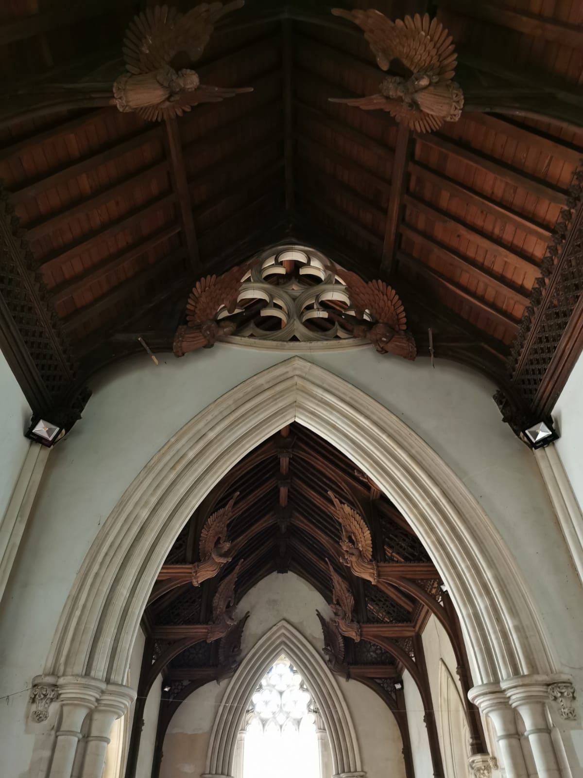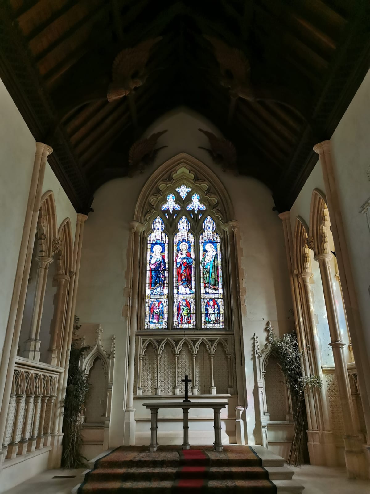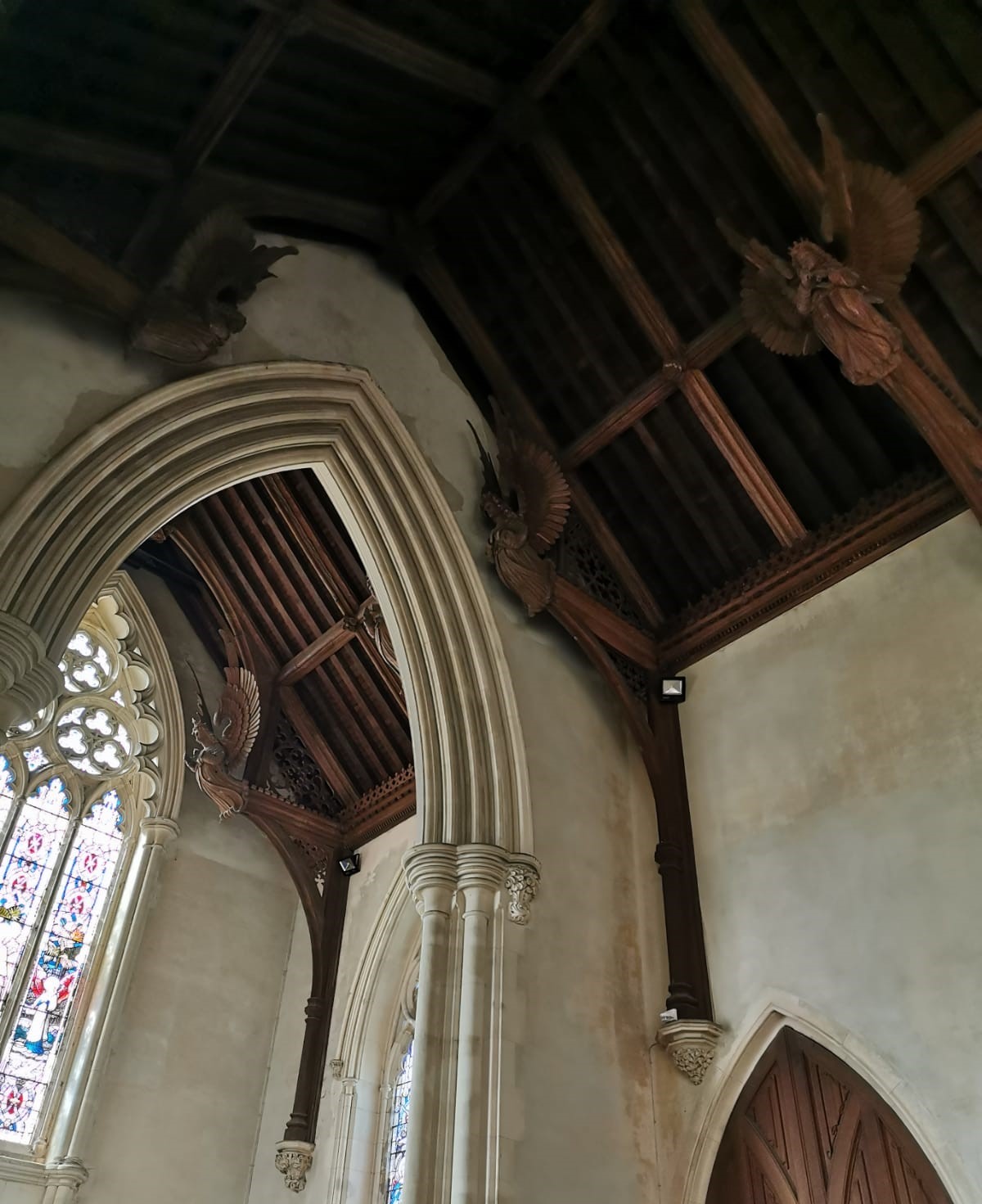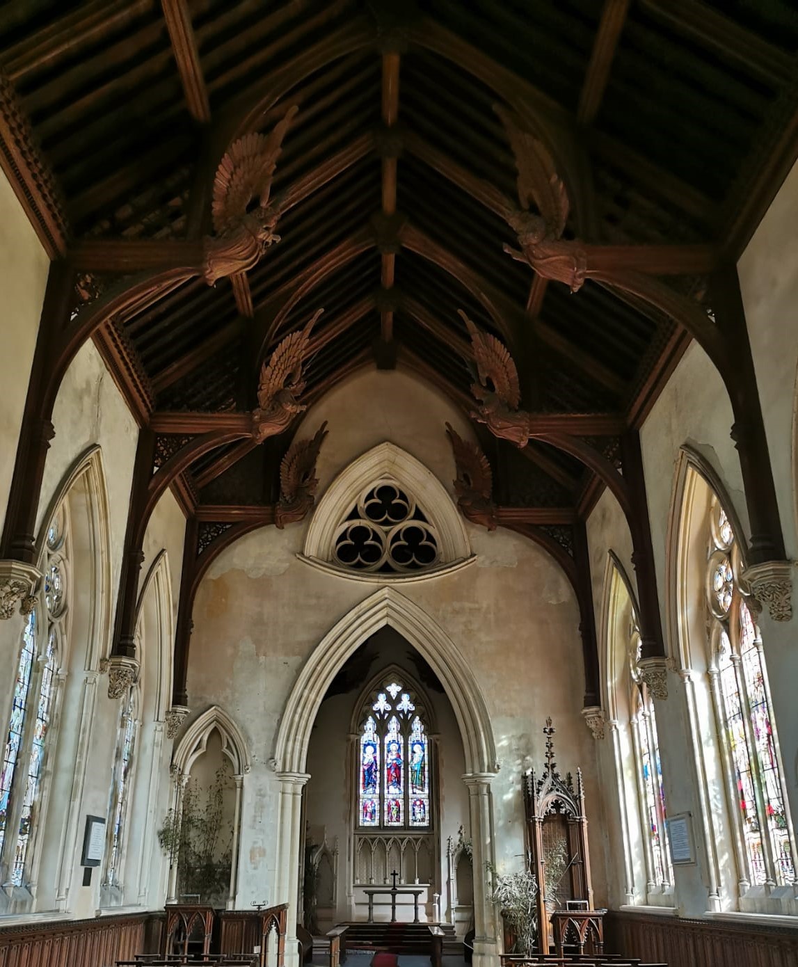 The immense hammerbeam roof over the nave is perhaps the most striking element. The angels were carved by James Minns (1824-1904), a well-known master whose carving of a bull’s head was used as the emblem for Colman’s mustard. Elwin could also count on the help of a professional draughtsman, Mr Horwood of Norwich. The stone carvings were also the work of a local artist, Robert Flood.