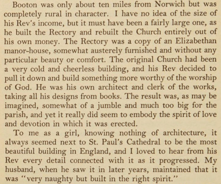 The architect Edwin Luytens (1869-1944) was a close friend of Whitwell’s. His wife, Lady Emily, entertained a long correspondence with Elwin and mentioned the parson at length in her memoir A Blessed Girl: