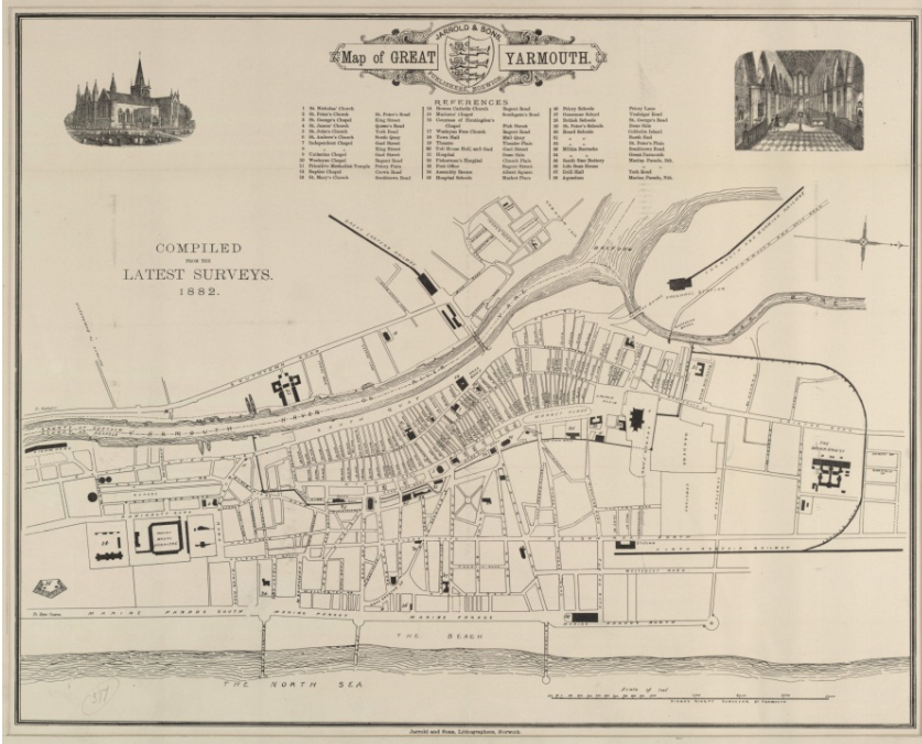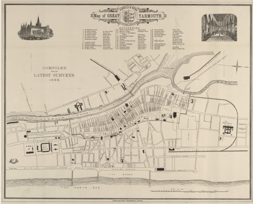The first fishing settlement in Great Yarmouth dates back to the 11th century. First mentioned in 1198, the ‘Rows‘ were very narrow cobbled alleyways running between the South Quay and the coastline. Measuring approximately 90-150 cm wide, in Mediaeval times there were as many as 145 rows. Since a law prevented from building outside the city walls until the 19th century, space limitation is thought to be the reason for such narrow, cramped streets. It has also been suggested that such a street layout could have been modelled on similar examples in Scandinavia and Scotland. The city was heavily bombed during WWII and the few alleys that survived were subsequently obliterated by modern redevelopment. In many ways, the Rows are synonymous with the town’s history. Their disappearance is a reminder of wartime destruction as well as unscrupulous planning.