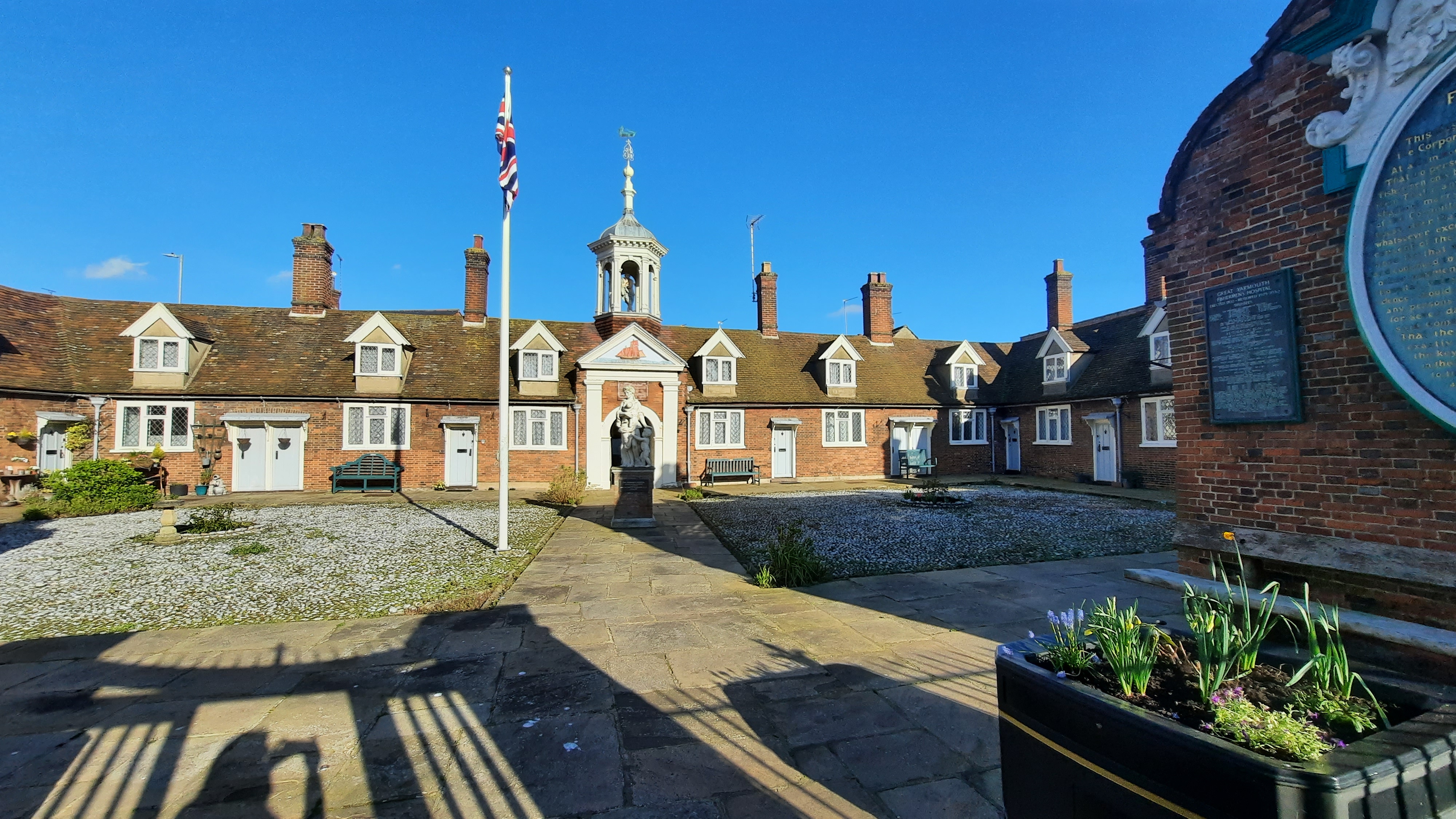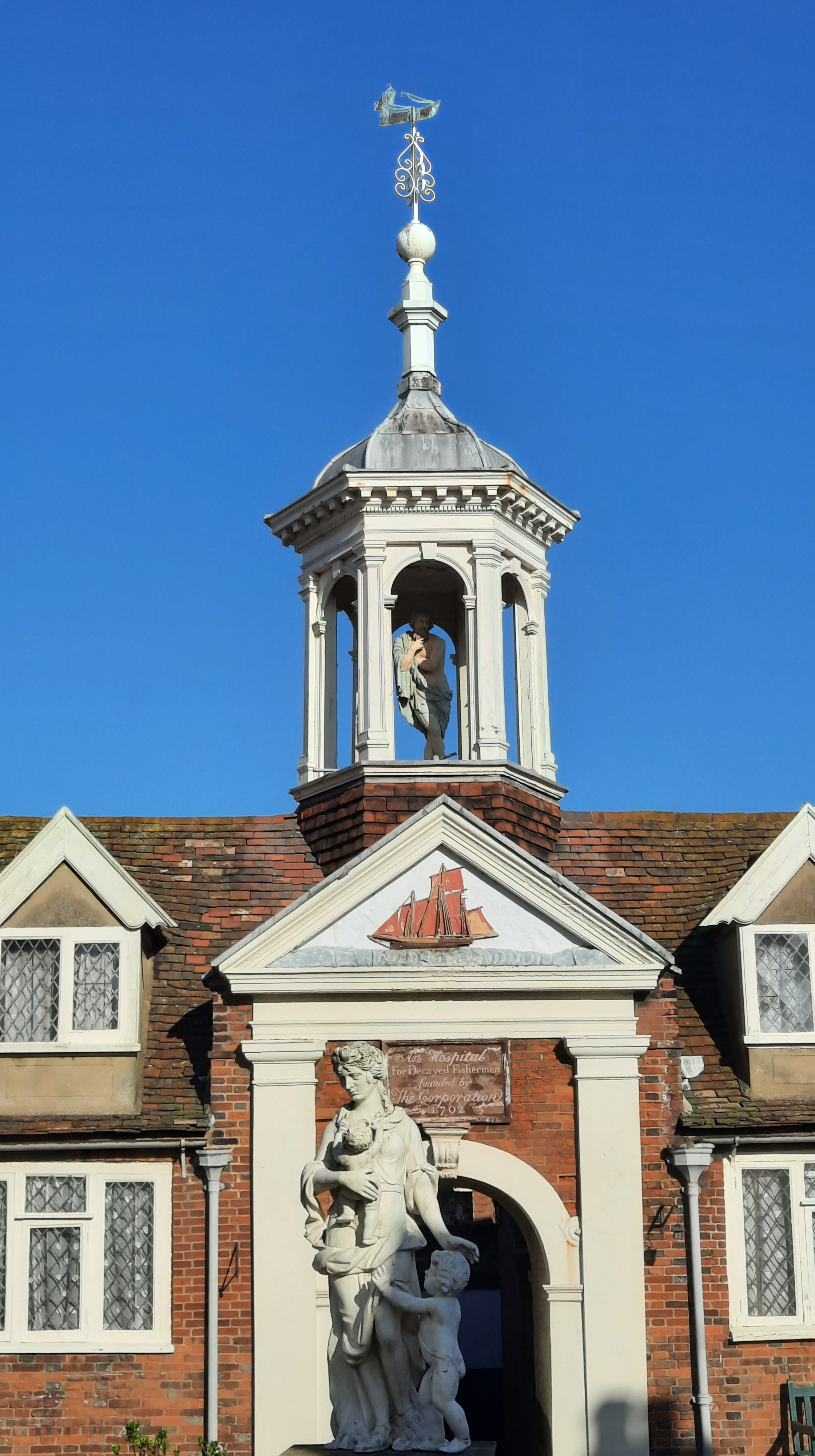 In 1702, the Corporation of Great Yarmouth founded this charitable institution to house ‘decayed fishermen’. The fishermen and their wives were accommodated in 20 terraced cottages arranged around a courtyard with a painted lead statue of Charity at its centre. In the hexagonal lantern at the back is a painted timber statue of St Peter (i.e., the saint notably associated with fishing). The pediment features a painted relief with a sailing ship proceeding backwards.